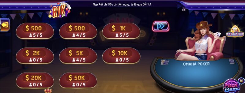 - Chọn bàn cược phù hợp: Khi chơi Omaha Poker tại Rikvip, hãy chọn bàn cược phù hợp với kinh nghiệm và khả năng của bạn. Nếu bạn mới bắt đầu chơi, hãy chọn bàn cược có mức cược thấp để tránh rủi ro và có thể tích lũy kinh nghiệm. Ngược lại, nếu bạn đã có kinh nghiệm, hãy chọn bàn cược có mức cược cao để có cơ hội giành được nhiều tiền thưởng hơn.